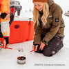It comes in a small tin that is filled with wax that you just need to start with a torch lighter, and it will build all on its own into a large bonfire that you can sit around wherever you are!